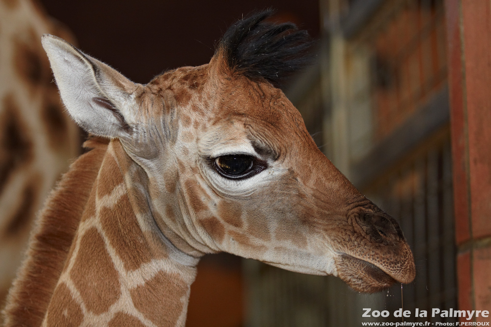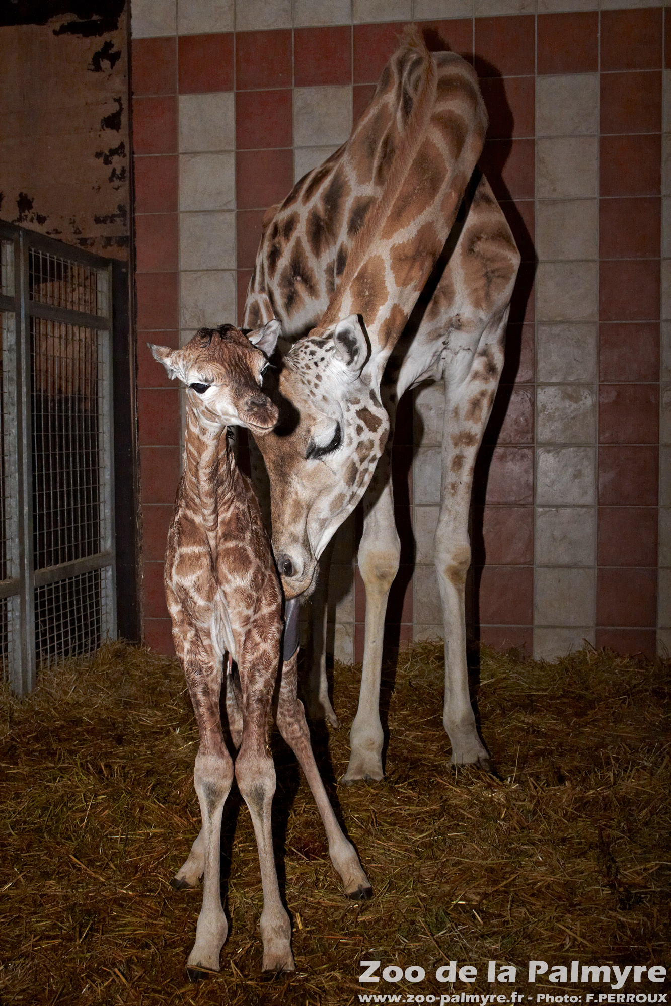 La femelle ne se couche pas pour mettre au monde son petit : il glisse le long des jambes de sa mère en naissant. Aussitôt, sa mère le lèche vigoureusement pour l’encourager à se mettre debout. Moins d’une heure après sa naissance, le girafeau fait ses premiers pas et commence à téter. Il mesure entre 1,50 et 1,80 m à la naissance.