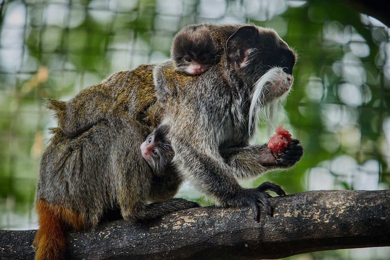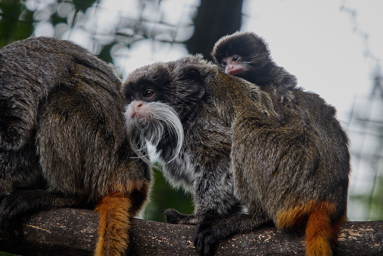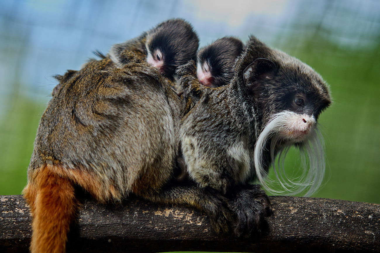 Des jumeaux tamarins empereurs barbus sont nés au parc il y a 3 semaines. Il s’agit de la deuxième portée de notre couple formé en 2021. Le groupe se compose désormais de 6 individus : le couple reproducteur, les deux mâles nés fin 2022 et les 2 nouveau-nés.