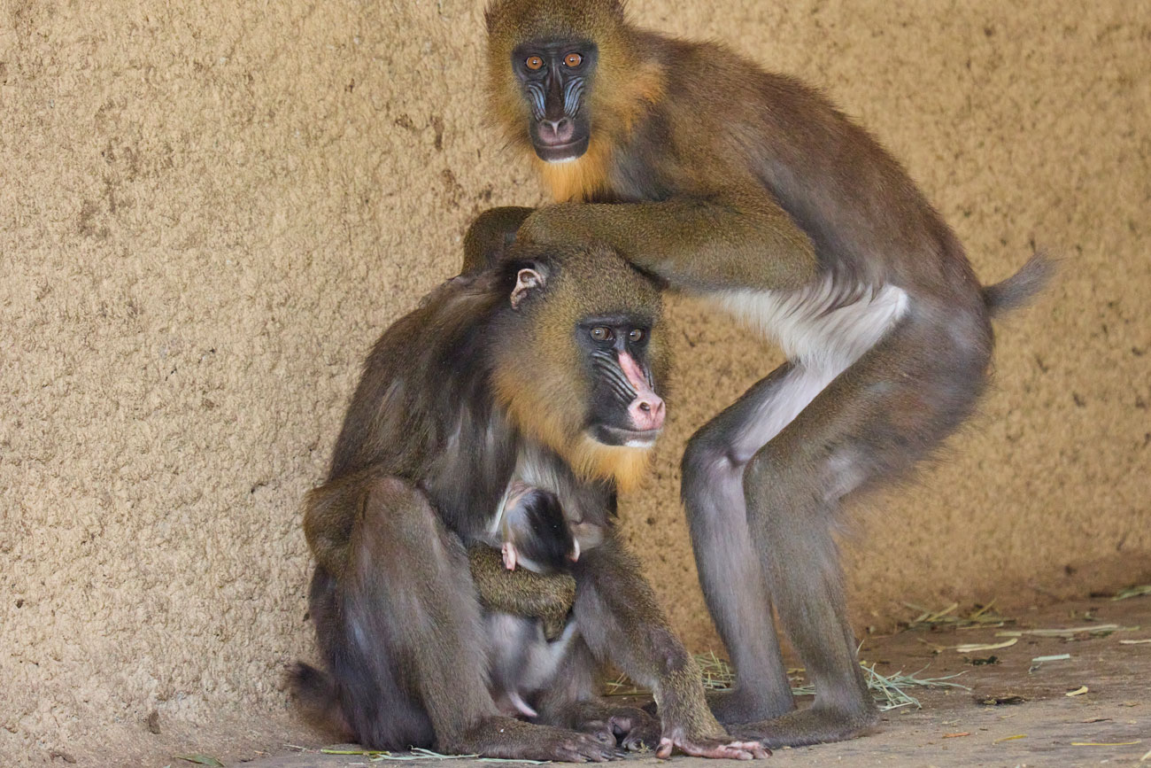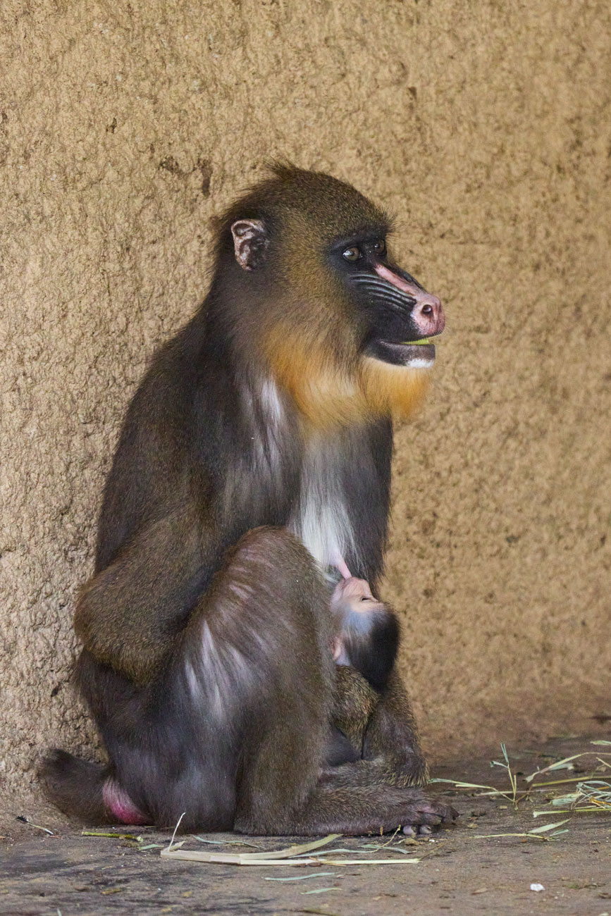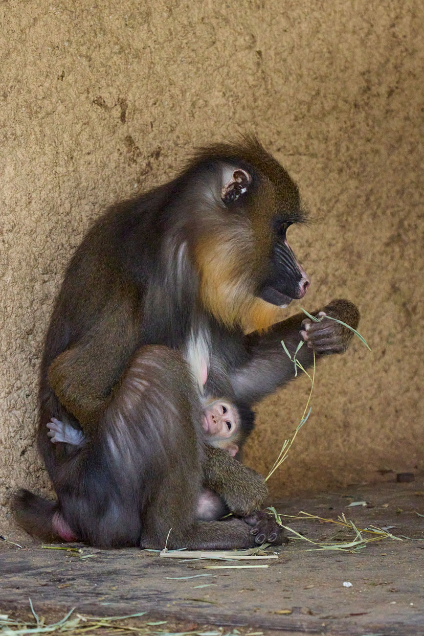 Quelques images du petit mandrill né il y a un mois au zoo, ce qui porte à 16 le nombre d’individus dans notre groupe !