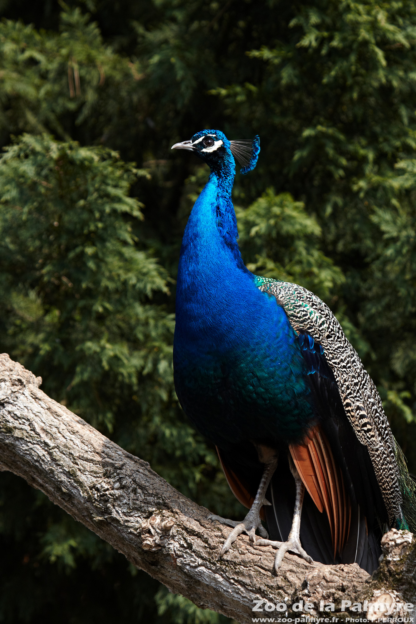 Le mâle se distingue de la femelle par le bleu-vert métallique de sa tête, de son cou et de sa poitrine mais surtout par ses plumes caudales qui peuvent atteindre 1,50 m de longueur et forment une traîne irisée, déployée en éventail spectaculaire notamment pendant la parade nuptiale. La qualité de la roue, la longueur de la traîne et le temps passé à parader conditionnent le succès du mâle auprès de la femelle.